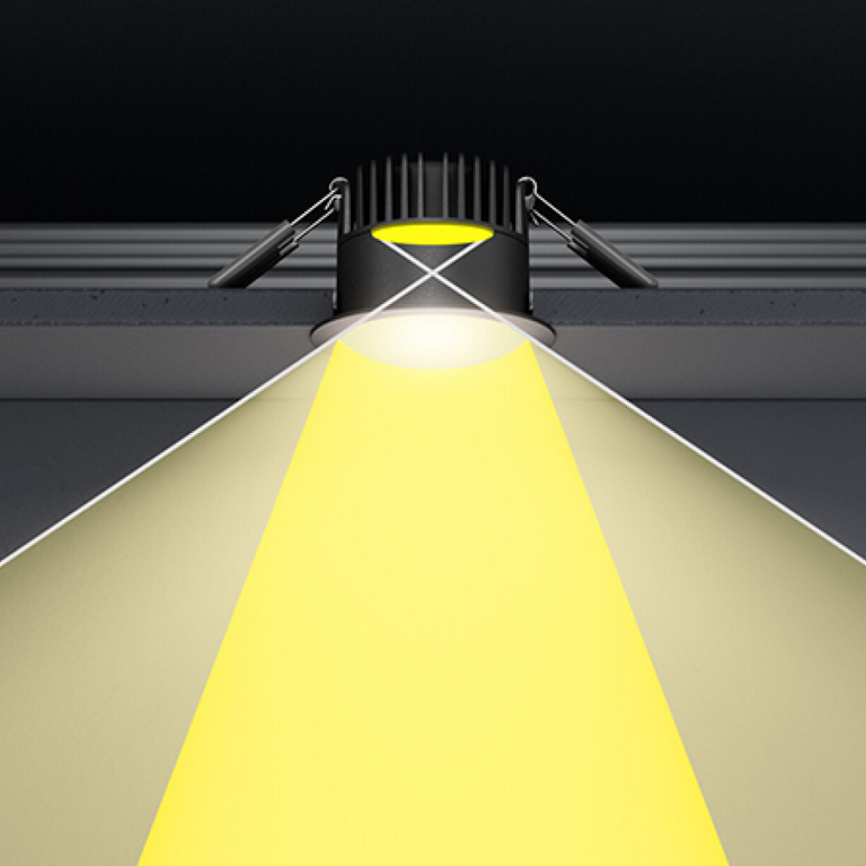 Die Lichtleistung der SPOT DARKLIGHT, das tief im Gehäuse versenkt ist, bietet einen weiten oberen Abschirmwinkel und damit eine hervorragende Entblendung - besonders in der schwarzen Gehäuseversion mit einer warmweißen Lichtfarbe. Zusammen mit der einfachen Dimmbarkeit der Leuchte, schafft dies einen hohen Lichtkomfort.